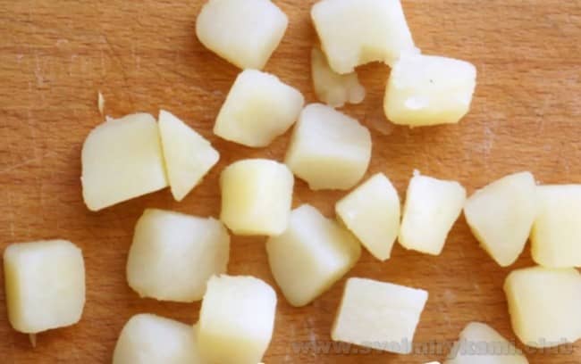 • З остиглого картоплі знімаємо шкірку і нарізаємо часточками або середніми кубиками.