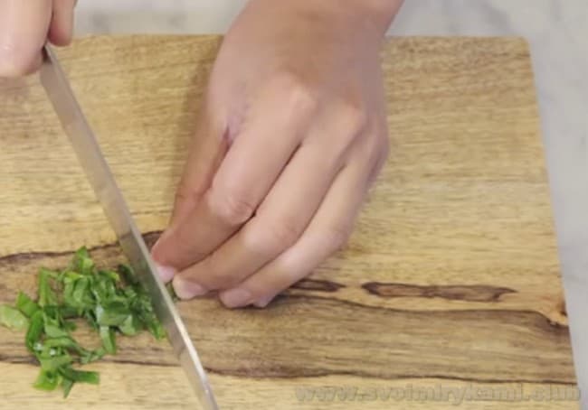 • Подрібнюємо листя базиліка. Кладемо їх в ступку.