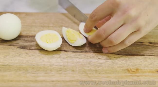• Яйця теж очищаємо і ріжемо на часточки. Якщо у вас перепелині яйця, то їх потрібно взяти 7-8 штук і просто розрізати навпіл.