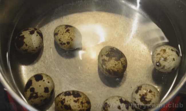 • Першим ділом відваримо яйця. Тут слід врахувати, що перепелиних потрібно взяти кілька штук більше, ніж звичайних. Для їх приготування потрібно менше часу: приблизно 5-7 хвилин з моменту закипання води.