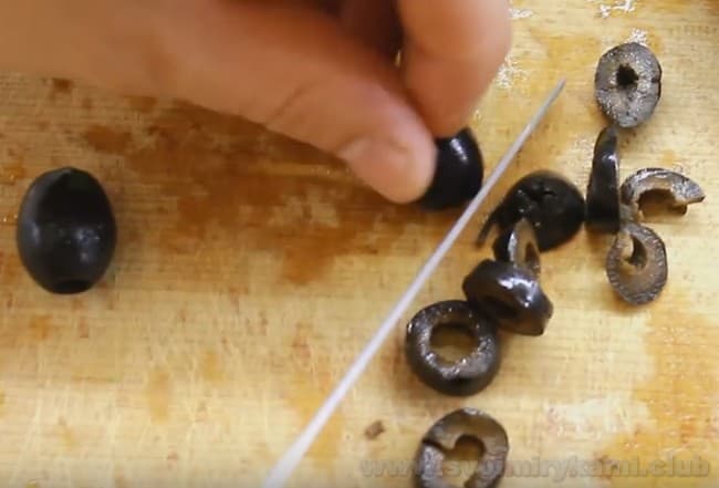 • Маслини або оливки нарізаємо кільцями. Замість оливок і маслин можна використовувати каперси.