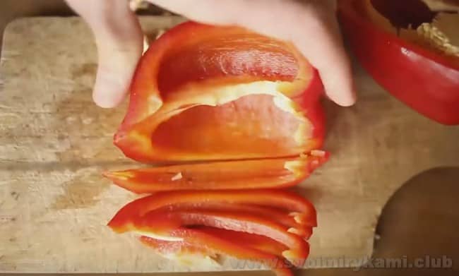 • Болгарський перець розрізаємо навпіл. Вирізаємо серцевину з насінням і нарізаємо соломкою.