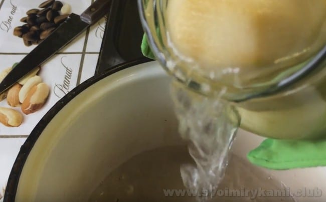 Використовуємо простерилізовані банки. Для цього можна просушити промиті банки в розігрітій до 180 С духовці або встановити над паровою лазнею і протримати так близько 5 хвилин.