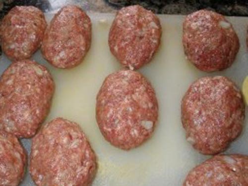 Вдома м’ясо промиваємо, знімаємо м’язові фасції, обсушуємо на рушник. Ріжемо м’ясо на великі фрагменти і перемелюємо його в м’ясорубці. Паралельно, очищаємо велику головку цибулі і дрібно ріжемо його. На 0,5 кг свіжого м’яса вам знадобиться 100 грам ріпчастої цибулі. Змішуємо м’ясо і цибулю.