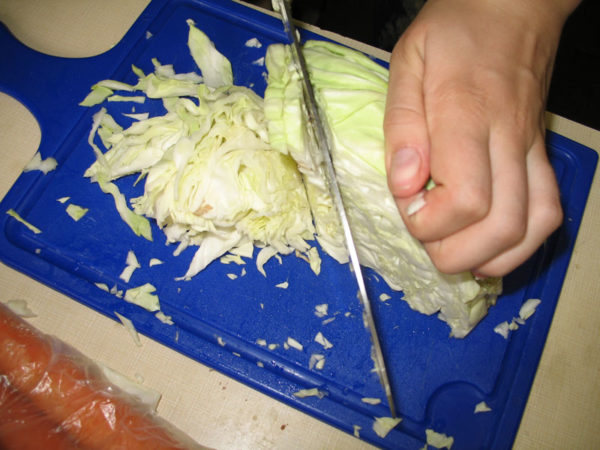 1. Візьміть всю наявну капусту дрібно нашаткуйте її за допомогою ножа або шинкування.