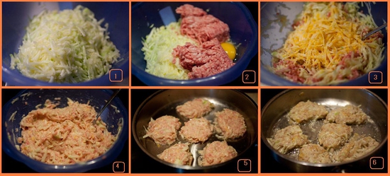 Почистіть кабачок від шкірки, якщо він старий, якщо м’який і молодий використовувати зі шкіркою. Молодий кабачок випускає багато соку, тому можна злегка його віджати. Змішати з яйцем, борошном і сметаною. М’ясо треба перекрутити через м’ясорубку., сир потерти на тертку. Все змішати. Підсмажити на розігрітій сковороді до готовності і можна їсти!