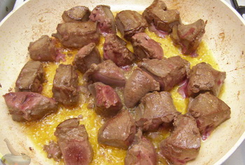 Яловичу печінку ріжемо на невеликі шматочки, ретельно промиваємо і викладаємо на розігріту сковороду. Протягом 10 хв. слід обсмажувати продукт, регулярно помішуючи його.