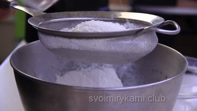 Просіяти борошно у велику миску, додайте туди ж дріжджі, цукор і сіль.