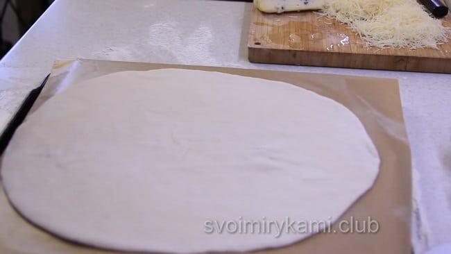 Розкачуємо тісто у вигляді круглої коржі. Потім покладіть його на деко, застелене пергаментом, і змастіть тісто оливковою олією.