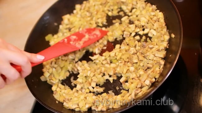 Поки підходить тісто для пиріжків з грибами, приготуємо начинку. Промийте гриби і наріжте їх на маленькі шматочки. Цибулю наріжте кубиками. Нагрійте сковороду і налийте в неї трохи олії. Додайте цибулю і гриби, обсмажуйте до готовності. Посоліть за смаком. Як правило, магазинні печериці готуються швидко, тому перевіряйте готовність станом лука.