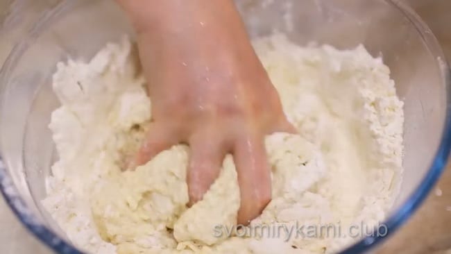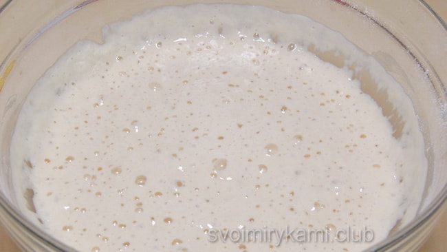 Просійте борошно і поступово додайте її в тісто, весь час помішуючи. Поки тісто рідке, скористайтесь віночком, він прекрасно розбиває грудки. Коли тісто загусне, можна заважати ложкою, а коли додасте все борошно, прийде час замісити тісто руками.
