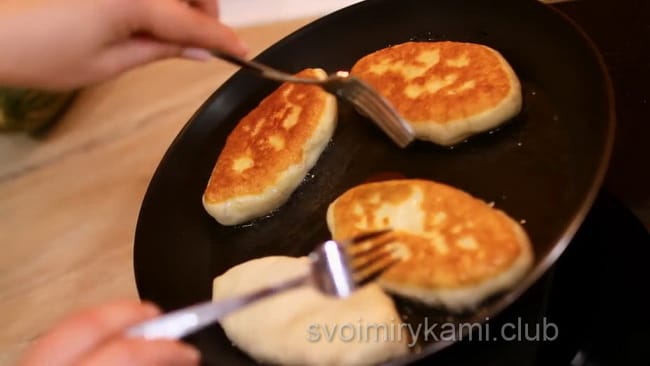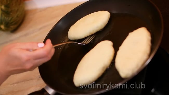 Розігрійте сковороду і налийте в неї рослинне масло. Його повинно бути досить багато. Приблизно стільки, щоб при смаженні зникла половина пиріжка. Якщо масла буде мало, він не прожариться. Смажте на середньому вогні до появи золотистої скоринки. Після цього переверніть пиріжок і дожаривайте до того ж стану. Готові пиріжку потрібно остудити.