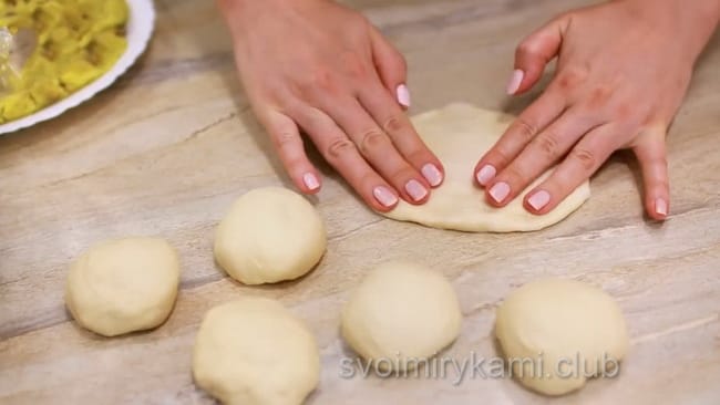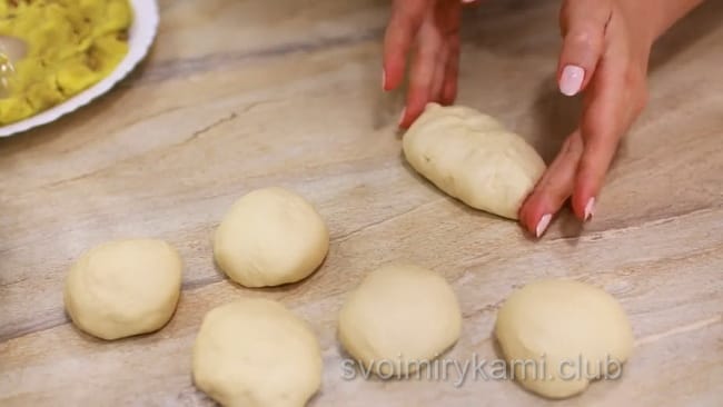 Розділіть тісто на шматочки, це потрібно робити руками або ножем. У мене вийшло 9 шматочків, але це залежить від розміру пиріжків. За бажанням можете зробити більше або менше. Кожен шматочок скачайте в колобок. Якщо у вас немає навичок замісу тіста, просто скачайте його в кульку зручним для вас способом. Кожен кульку треба розкачати качалкою і вкласти в нього трохи начинки.