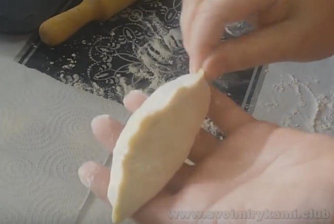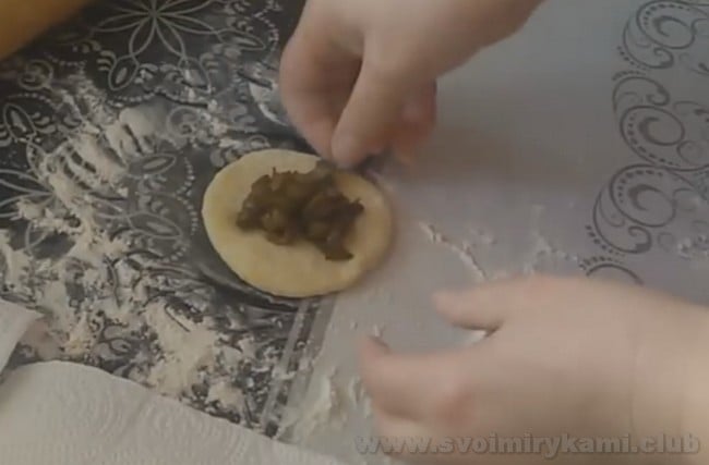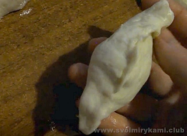 • Пиріжки заліплюємо ретельно, не залишаючи навіть мінімальних щілин. За формою пиріжок можна зробити круглим або довгастим, у другому випадку їх потрібно злегка приплюснути.
