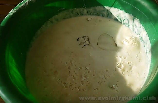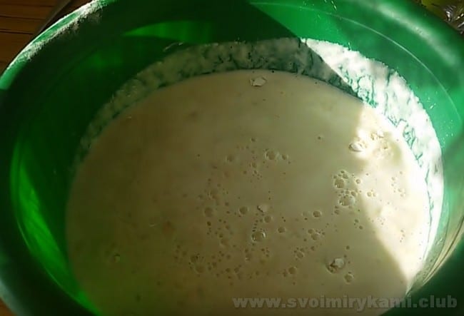 • В молоко, підігріте до температури трохи вище кімнатної, висипаємо дріжджі, цукор-пісок 150 г просіяного борошна. Всі інгредієнти ретельно перемішуємо.