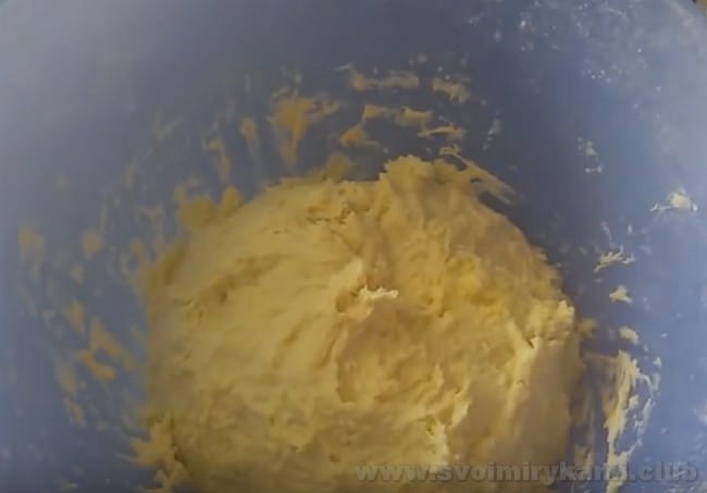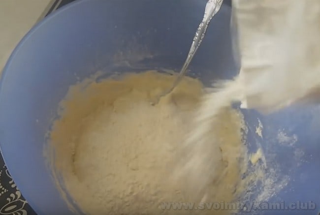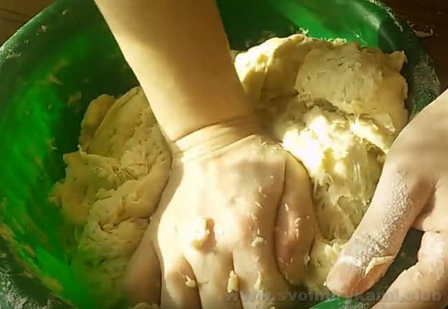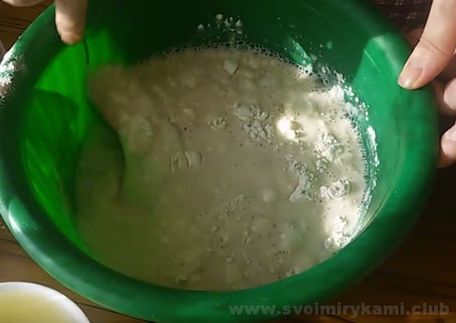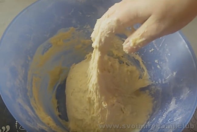 • В отриману суміш потроху вводимо залишився молоко, борошно і вимішуємо не липнущее до долонь тісто.