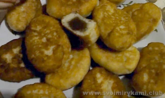 • Як би ми не намагалися ретельно заліплювати пиріжки, але частина варення втече, і вони вийдуть в красивій карамелизованной скоринці. Обсмажені готові пиріжки знімаємо з сковороди і покласти на паперовий або вафельний рушник, воно вбере зайвий жир, а пиріжки за цей час охолонуть.