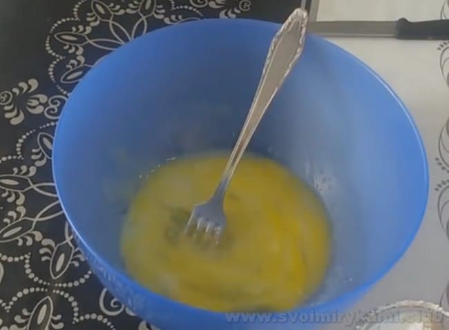 • У миску вбиваємо яйце, солимо його і трохи збиваємо, щоб сіль розчинилася. Вливаємо отриману суміш в тісто. Додаємо масло.