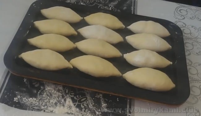 • Деко при потребі застеляємо папером для випічки і змащуємо її маслом. Викладаємо пиріжки на папір з невеликою відстанню один від одного, щоб вони не заважали зростати «сусіда» в процесі випічки.