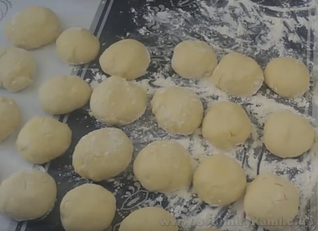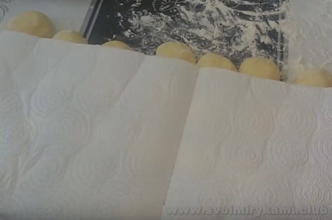 • Дістаємо тісто, ділимо його на 12 (або більше) рівних частин, надаємо їм округлу форму і кладемо на дошку, злегка присипану борошном, зверху накриваємо рушником.