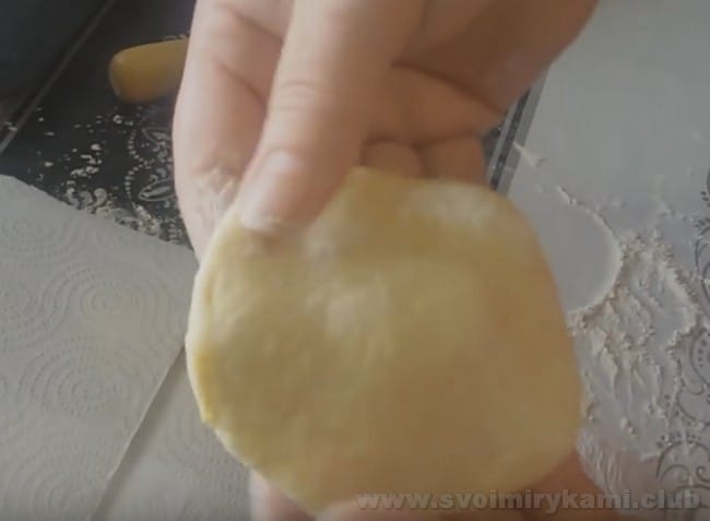• По черзі беремо кожну з 12 частин тесту і пальцями надаємо форму круглої коржі, розтягуючи заготівлю від центру до країв.