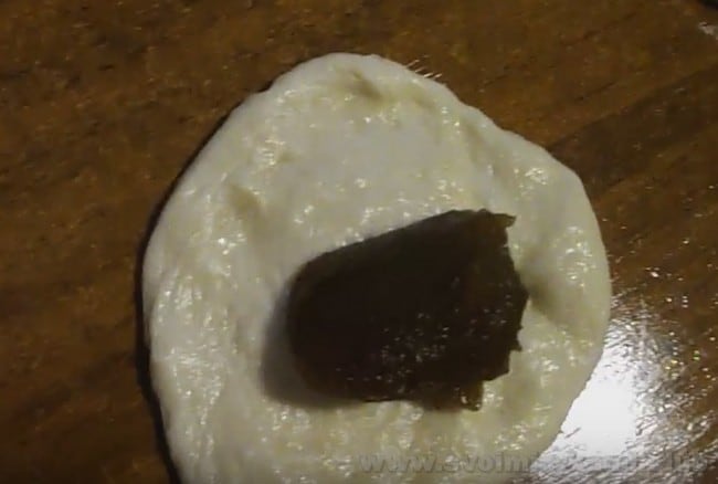 • У центр коржі покладемо 1, максимум 2 чайних ложки повидла (в залежності від розміру коржі), при цьому уникаючи попадання начинки на краю. В іншому випадку пиріжок буде складно заліпити.