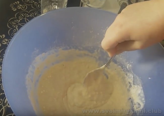• Потроху додаємо половину загального обсягу трохи підігрітого молока, дві склянки попередньо просіяного борошна і постійно перемішуємо.