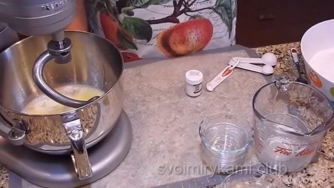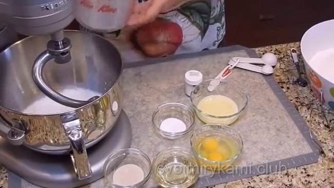 Пізніше ми додаємо частину борошна і починаємо замішувати тісто. Коли перша частина у нас замесилась, ми додаємо решту борошна і повністю замішуємо тісто.