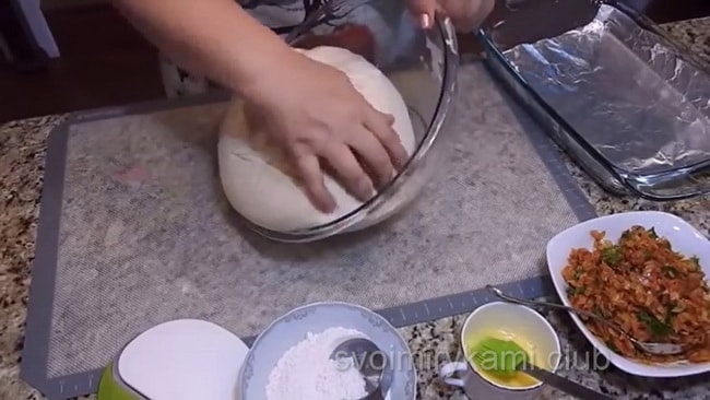 - На нього кладемо шар першого тесту. Загортаємо куля першого тесту другим.Кладемо новий шар тіста на змащену борошном тарілку швом донизу.