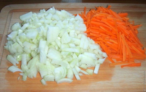 Її треба розігріти і обсмажити в ньому м’ясо. Це займе хвилин 20-25. Далі потрібно додати моркву і цибулю, які попередньо нарізати брусочками (моркву можна натерти на тертці). Овочі з м’ясом обсмажувати 10 хвилин.