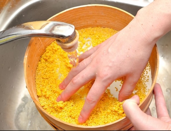 Перший етап — промивка пшона в теплій воді, другий етап злегка промити в холодній воді. Мити крупи потрібно до прозорої рідини.