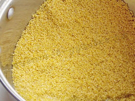 Перший етап — промивка пшона в теплій воді, другий етап злегка промити в холодній воді. Мити крупи потрібно до прозорої рідини.