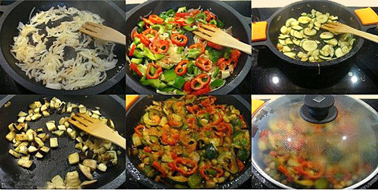 Спочатку потрібно розігріти на сковороді олію, нарізати цибулину і обсмажити її на невеликому вогні. Далі солодкий перець очистити і нарізати великими скибочками. Коли цибуля стане золотистого кольору, всипати до нього перець і смажити, постійно помішуючи. Буквально через дві хвилинки у овочі додати трохи перцю, солі і половину суміші з трав.