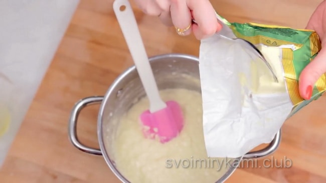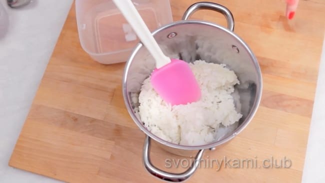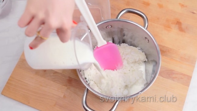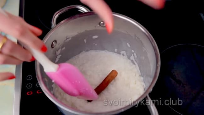 Чи знаєте ви? Щоб рисова заготовка не підгоріла, намагайтеся не припиняти перемішування ні на хвилину під час варіння. Якщо каша все одно почала трохи прилипати, зменшити інтенсивність вогню до мінімуму і на хвилинку, зніміть каструлю з плити, все ще розмішуючи масу.Другий етап