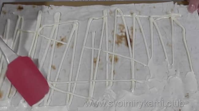Розкладіть лаваш на робочій поверхні і змастіть його майонезом. Не лінуйтеся, розподіліть майонез рівномірно по всьому листу, не забуваючи про краю.