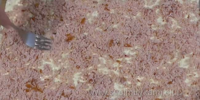 Поверх майонезу розкладіть натерту шинку і акуратно розрівняйте її.