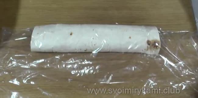 Поверніть лаваш в дуже щільний рулет, розріжте його на 2 частини і загорніть кожну в харчову плівку. Обидва рулетика покладіть в холодильник на 2 години – нехай гарненько просочаться!