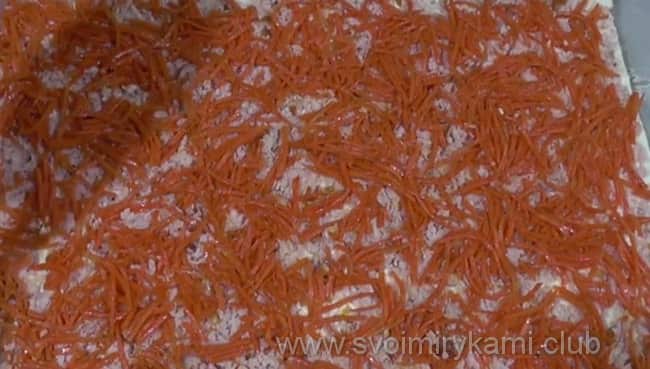 Далі настає черга моркви по-корейськи: викладіть її на подушку з шинки і злегка притисніть по всій поверхні виделкою.