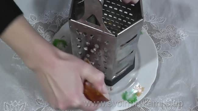 Натріть шинку на крупній тертці і постарайтеся по ходу справи не з’їсти її всю (принаймні, у мене постійно так відбувається, може бути, у вас з силою волі справи йдуть трохи краще).