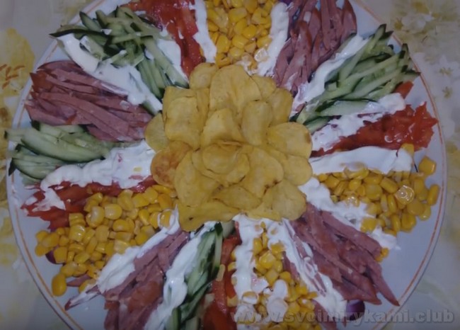 Рецепт салату «Козел на городі» з ковбасою, корейською морквою і чіпсами