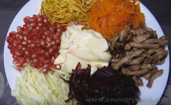 До того ж подібна подача страви, коли всі компоненти не змішані, а лежать окремо, дадуть можливість вашим гостям самим побути трохи кулінарами на вашому святі: кожен з’єднає все, що захоче і з чим захоче – адже раптом у когось з гостей алергія на якийсь продукт, або він не їсть, наприклад, м’ясо. Плюс до усьому, можна підготувати кілька заправок: майонез, рослинна олія або соус. Хоча в моїх рецептах я використовую по максимуму шкідливі (такі як майонез), але смачні продукти.