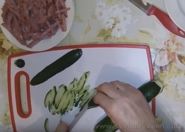 М’ясо можна вибрати абсолютно будь-яка: хоч свинину, хоч яловичину, хоч звичайне, хоч копчене, – все на ваш розсуд. Огірок і помідор обов’язково використовуємо свіжі.