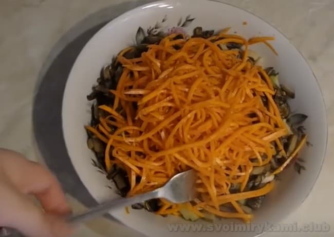 Дуже поширені варіанти: з куркою (відвареного або копченого), свининою чи ковбасою (можна використовувати варену або сирокопчену). Обсмажені цибуля і морква надають салату м’який смак і ситність. Солоний або маринований огірочок – гостроту.