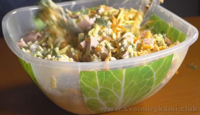 Рецепт салату «Обжорка» з ковбасою по крокам