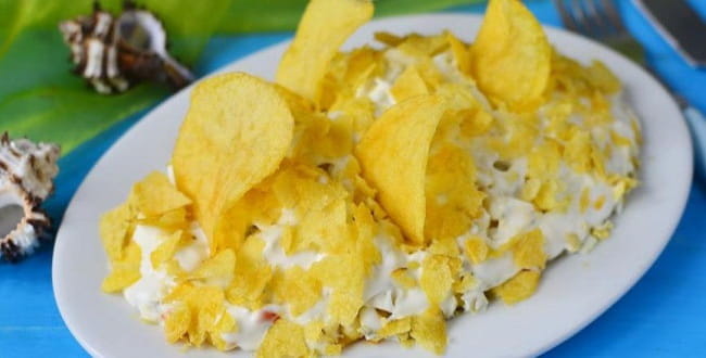 - Остаточне оформлення салату робимо безпосередньо перед подачею на стіл, інакше чіпси стануть вологими і втратять форму.