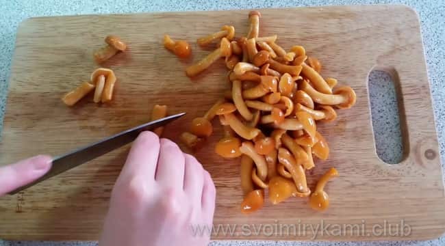 Якщо гриби великі, то їх потрібно буде розрізати уздовж на кілька частин. Перекладаємо гриби до шинки.