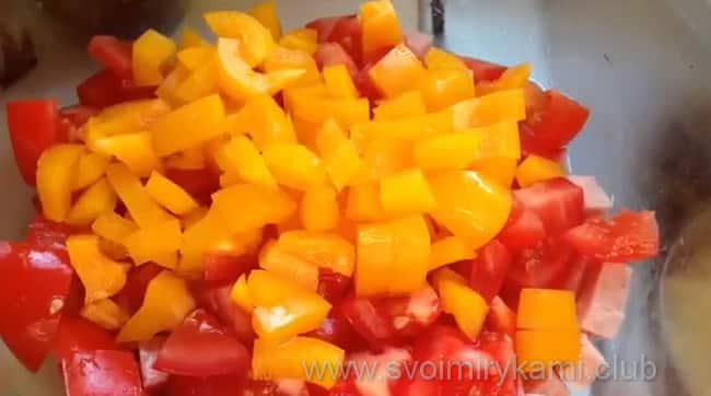 Так само, як і шинку нарізаємо болгарський перець. Перед нарізанням потрібно його розрізати навпіл і вичистити серединки з насінням. Я беру жовтий і зелений перець, тоді салат виходить яскравий і різнобарвний.Сир можна натерти великою теркою, але мені більше подобається, коли він нарізаний тонкою соломкою.Середніми шматочками нарізаємо помідори. Якщо у вас черрі, то просто розрізаємо їх на дві або чотири частини.