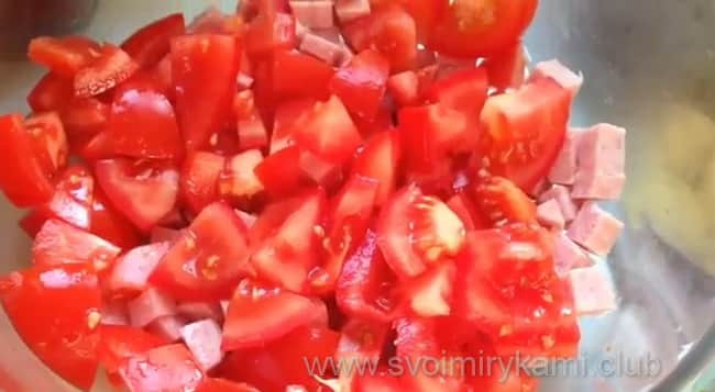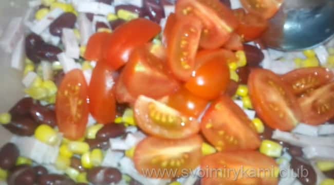 - Салат з шинкою, помідорами, сиром і кукурудзою відеорецепт