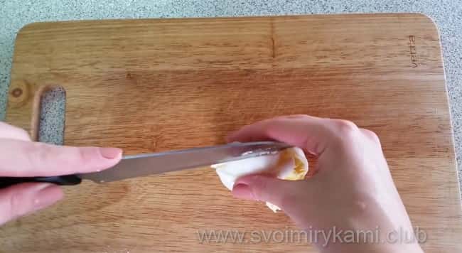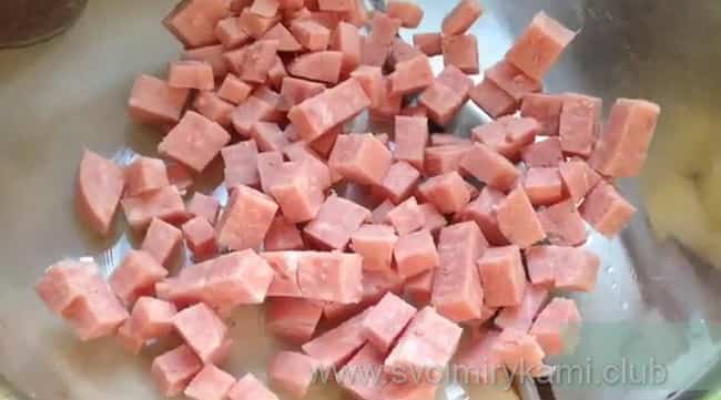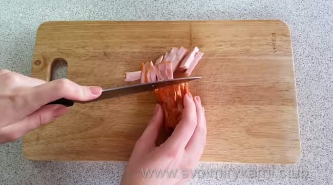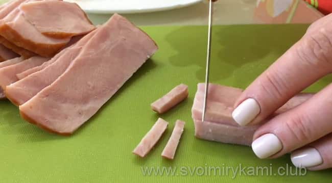 Для його приготування нарізаємо шинку нетовстий соломкою.