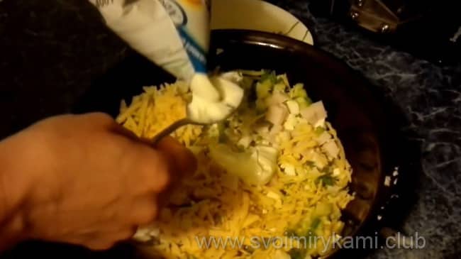 Додаємо майонез і перемішуємо. За бажанням можна додати в салат, зелена цибуля, болгарський перець або консервовану кукурудзу, а також зробити салат шарами, як на одному блюді, так і в декількох креманках.